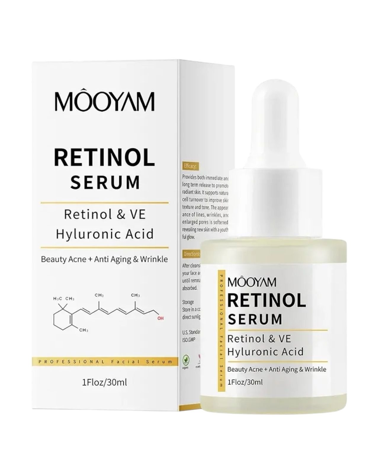 Suero de retinol, vitamina E y ácido hialurónico Mooyam. Proporciona una liberación inmediata y a largo plazo para promover una piel radiante. Apoya la renovación celular natural para mejorar la textura y el tono. La apariencia de líneas finas, arrugas y poros dilatados se suaviza, revelando una piel nueva con un brillo juvenil.